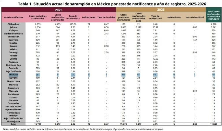 A nivel nacional, México acumula más de 11 mil casos confirmados entre 2025 y lo que va de 2026, además de cinco defunciones registradas este año.